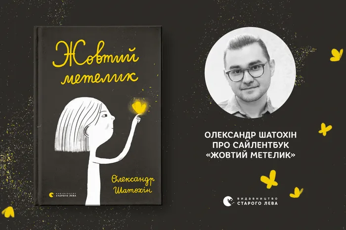 «Жовтий метелик» – «тиха книжка» Олександра Шатохіна, що промовляє без слів. В ілюстраціях зашифрована метафоричність, тільки тут треба не читати між рядків, а бачити між ліній, кожна деталь несе смислове навантаження. Художник розповідає історію малюнками: дівчинка між вирв і колючих дротів втікає від страхів війни. Світло наших душ може зцілити темряву і чим більше «жовтих метеликів» пурхатимуть у сьогоденні, тим швидше життя переможе. Олександр Шатохін розповідає як з’явилася книжка і чому від обрав для висловлення формат сайлентубуку.