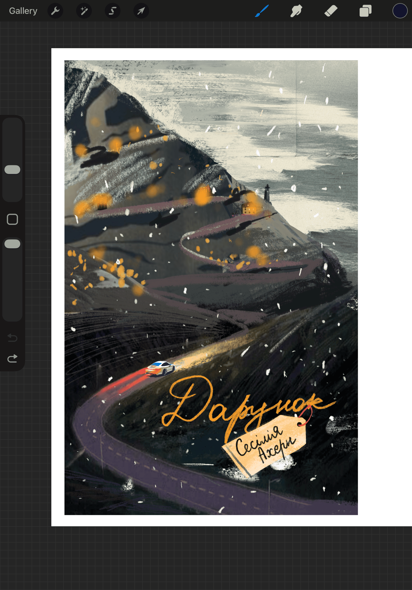Моя уява дуже сильно вхопилась саме за описи холодних пейзажів Ірландії, дорогу додому по узбережжі океану, яку долав головний герой та теплі вогні дому, що виднілись на горизонті. Тому я вирішила, що саме це може класно передати атмосферу твору та стати візуальною метафорою сюжетної лінії героя — людини, яка постійно поспішає й прагне бути першою, але, крім себе, не здатна цінувати те, що має: затишок дому та люблячу сім’ю. Ось що з цього вийшло: