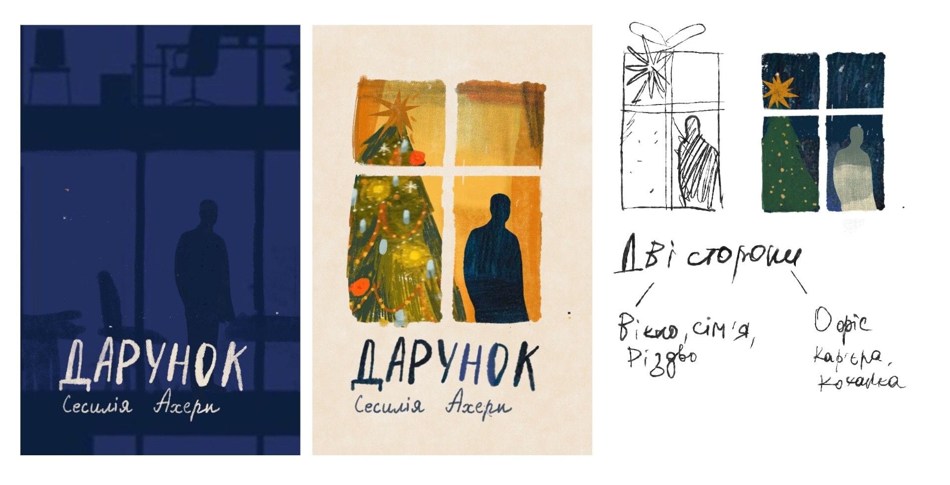 Головний герой Лу часто стоїть у вікні, коли дивився на загадкового безхатька, що сидів під офісом, чи коли спостерігав за “другим собою”, зрештою, книга починається з розбитого вікна. Тож саме вікно з силуетом Лу стало моєю першою замальовкою під час читання. Тоді я зауважила, що за формою вікно нагадує подарунок, і вирішила об’єднати ці два образи. Вийшов такий лаконічний варіант з вікном, де є свято, затишок, пахне мандаринками проте силует у вікні є доволі напруженим, наче він енн хоче там бути. На звороті обкладинки, а вирішила додати той ж силует героя проте вже у вікні холодного та незатишного офісу. Тим самим натякнувши на дуальність героя.
