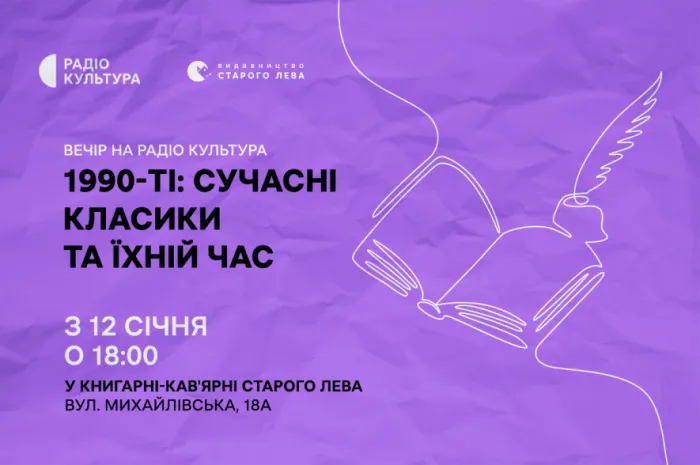 У п’ятницю, 12 січня, Радіо Культура презентує слухачам новий проєкт, створений у партнерстві з Видавництвом Старого Лева. Щоп’ятниці о 18:00 ведучі Радіо Культура зустрічатимуться з українськими письменниками у книгарні-кав’ярні Старого Лева на Михайлівській 18А, щоб поговорити про нашу літературу 1990-х років.