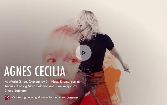 А ви знали, що в Національному Театрі в Осло є вистава за книгою Марії Ґріпе «Дивовижна історія Агнес Сесилії»? Сценічна версія роману Марії Ґріпе «Дивовижна історія Агнес Сесилії» — це історія для дітей і молоді, сповнена чудес, таємниць і надприродних елементів. Що відбувається вдома у Нори? Їй починають снитися дивні сни, вона отримує таємничі телефонні дзвінки, книга незрозумілим чином падає з книжкової полиці, а лялька починає жити власним життям. І чи не здається їй, ніби хтось ходить по кімнаті, дивлячись на неї? Хто шукає з нею контакт? Про це все можна дізнатися з захопливої історії Марії Ґріпе.