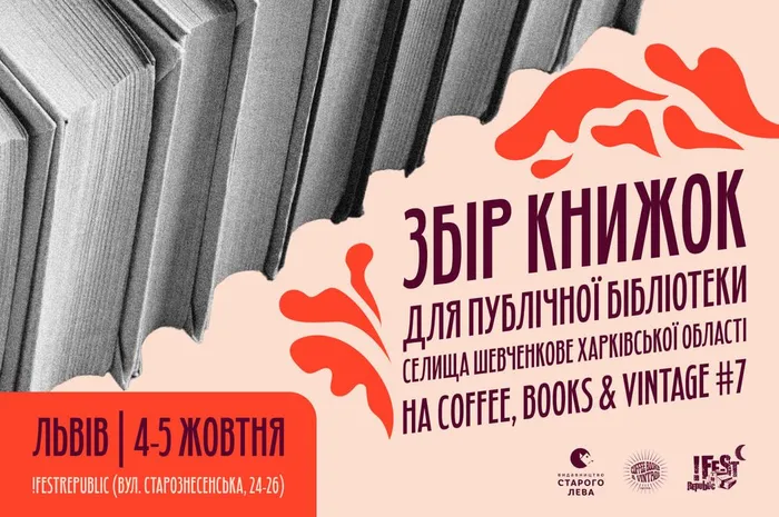 Ми оголошуємо збір книжок для Публічної бібліотеки селища Шевченкове Харківської області на Coffee, Books & Vintage #7, що відбудеться 4-5 жовтня у Львові на території !FESTrepublic (вул. Старознесенська, 24-26). Тож запрошуємо у ці дні брати книги з собою, або придбати їх під час події на стендах видавництв! Деталі про подію >>> за посиланням.