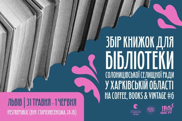 Саме тому ми оголошуємо збір книжок для Публічної бібліотеки Солоницівської селищної ради на Coffee, Books & Vintage #6, що відбудеться 31 травня - 1 червня у Львові на території !FESTrepublic (вул. Старознесенська, 24-26). Тож запрошуємо у ці дні брати книги з собою, або придбати їх під час події на стендах видавництв! Деталі про подію >>>