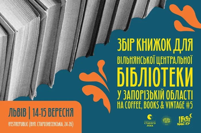 Саме тому ми оголошуємо збір книжок для Вільнянської центральної бібліотеки на Coffee, Books & Vintage #5, що відбудеться 14-15 вересня у Львові на території !FESTrepublic (вул. Старознесенська, 24-26). Тож запрошуємо у ці дні брати книги з собою, або придбати їх під час події на стендах видавництв! Деталі про подію >>> за цим посиланням.