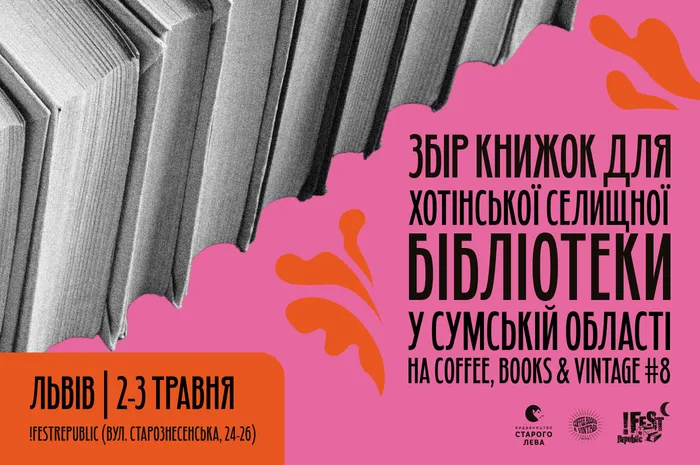 Ми оголошуємо збір книжок для Хотінської селищної бібліотеки на Сумщині на Coffee, Books & Vintage #8, що відбудеться 2-3 травня у Львові на території !FESTrepublic (вул. Старознесенська, 24-26). Тож запрошуємо у ці дні брати книги з собою, або придбати їх під час події на стендах видавництв!